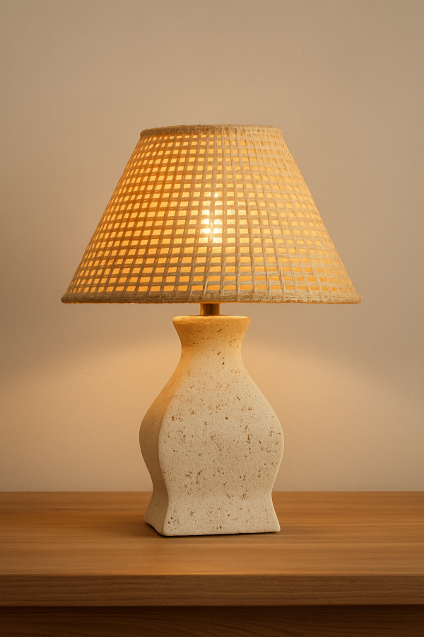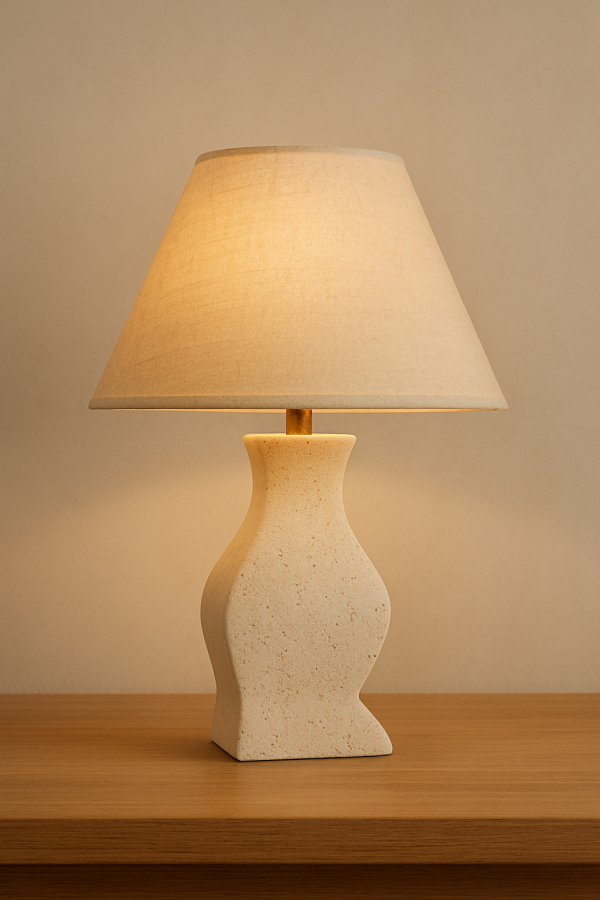 1: Crafted from premium travertine stone, this table lamp showcases a naturally speckled texture that exudes timeless elegance.
