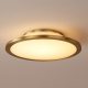 This modern flush mount ceiling light features a sleek, minimalist design, combining a vintage gold brushed finish with a clean white acrylic shade.